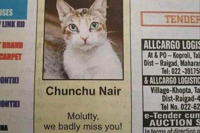 ചുഞ്ചു നായര് ഞങ്ങളുടെ ഇളയ മകളായിരുന്നു. ഞങ്ങള്ക്കവള് റാണിയായിരുന്നു, വീടിനെ നിര്ണ്ണയിക്കുന്ന ഘടകമായിരുന്നു. അവളുടെ വിയോഗത്തിന്റെ വേദനയിലാണ് ഞങ്ങളിപ്പോഴും. അരുമയായ പൂച്ചയുടെ വിയോഗത്തില് പത്രപ്രരസ്യം നല്കിയ മലയാളി കുടുംബത്തിന്റെ വാക്കുകളാണ്. ചുഞ്ചു എന്ന പേരിനൊപ്പം നായര് എന്ന് ചേര്ത്തത് ജാതി ചിന്തിച്ചല്ല, പെണ്മക്കളുടെ പേരുപോലെ നല്കിയതാണെന്നും കുടുംബം വ്യക്തമാക്കുന്നു. ടൈംസ് ഓഫ് ഇന്ത്യയാണ് കുടുംബത്തെക്കുറിച്ച് വാര്ത്ത നല്കിയിരിക്കുന്നത്. ടൈംസ് ഓഫ് ഇന്ത്യയുടെ മുംബൈ എഡിഷനിലായിരുന്നു പരസ്യം വന്നത്. നവി മുംബൈയിലെ സ്ഥിരതാമസക്കാരാണ് അനിത നായരും (യഥാര്ത്ഥ പേരല്ല, പേര് വെളിപ്പെടുത്താന് ഈ കുടുംബം ആഗ്രഹിക്കുന്നില്ല) കുടുംബവും.