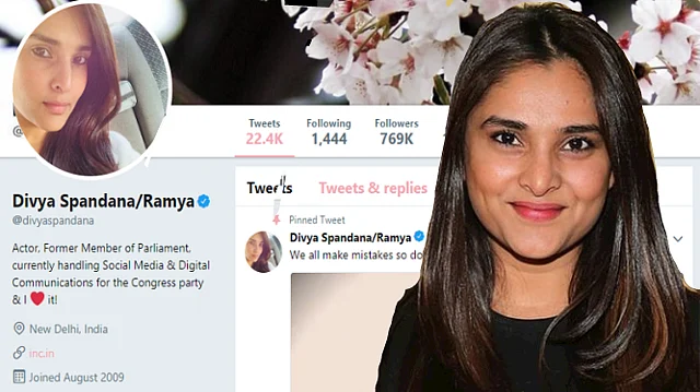 കോണ്ഗ്രസിന്റെ സോഷ്യല് മീഡിയ മേധാവിയും സിനിമ താരവുമായ ദിവ്യ സ്പന്ദന തന്റെ ട്വിറ്റര്, ഇന്സ്റ്റഗ്രാം അക്കൗണ്ടുകള് ഡിലീറ്റ് ചെയ്തു. ധനമന്ത്രിയായി ചുമതലയേറ്റ നിര്മ്മല സീതാരാമനെ അഭിനന്ദിച്ച ട്വീറ്റ് ആണ് ദിവ്യ അവസാനമായി പോസ്റ്റ് ചെയ്തത്. ഇന്ദിരാ ഗാന്ധിക്ക് ശേഷം ധന മന്ത്രാലയം കൈകാര്യം ചെയ്യുന്ന വനിത മന്ത്രിക്ക് ആശംസയെന്നായിരുന്നു ദിവ്യയുടെ ട്വീറ്റ്.
