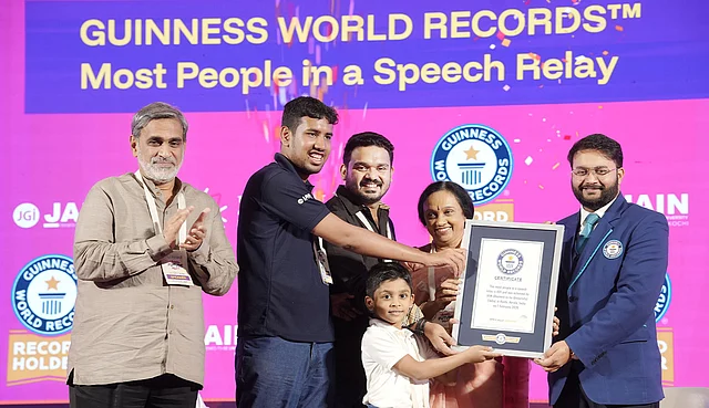 കൊച്ചി ജെയിന് യൂണിവേഴ്സിറ്റിയുടെ 'സമ്മിറ്റ് ഓഫ് ഫ്യൂച്ചര് രണ്ടാം പതിപ്പിന് ഗിന്നസ് റെക്കോഡ്. സമ്മിറ്റിന്റെ ഭാഗമായി 401 പേര് പങ്കെടുത്ത റിലേ സ്പീച്ചാണ് ഗിന്നസില് ഇടം പിടിച്ചത്. 10 മണിക്കൂര് 25 മിനിറ്റുകൊണ്ടാണ് റിലേ പൂര്ത്തിയാക്കിയത്. സൂറത്തില് നടന്ന 313 പേര് പങ്കെടുത്ത റിലേ സ്പീച്ചായിരുന്നു ഇതുവരെയുള്ള റെക്കോഡ്. ഇതാണ് കൊച്ചിയില് നടന്ന സമ്മിറ്റ് ഓഫ് ഫ്യൂച്ചര് മറികടന്നത്. രാവിലെ ഒമ്പതിന് ആരംഭിച്ച പരിപാടി രാത്രി 7.25ന് ആണ് സമാപിച്ചത്. കുറഞ്ഞത് ഒരു മിനിറ്റും പരമാവധി മൂന്നു മിനിറ്റുമായിരുന്നു പ്രസംഗ സമയം. കൂടാതെ, ഒരാളുടെ പ്രസംഗ ശേഷം പത്ത് സെക്കന്ഡിനുള്ളില് അടുത്ത പ്രസംഗം തുടങ്ങണമെന്ന മാനദണ്ഡവുമുണ്ട്. ഇവയെല്ലാം കൃത്യമായി പാലിച്ചാണ് റിലേ സ്പീച്ച് പൂര്ത്തിയാക്കിയത്. സമ്മിറ്റ് ഓഫ് ഫ്യൂച്ചറിന്റെ സമാപന ദിനം നടന്ന ചടങ്ങില് ഗിന്നസ് റെക്കോഡ് അഡ്ജൂഡിക്കേറ്റര് സ്വപ്നില് ദങ്കാരിക്കരില് നിന്ന് ജെയിന് യൂണിവേഴ്സിറ്റി ന്യൂ ഇനിഷ്യേറ്റീവ്സ് ഡയറക്ടര് ഡോ. ടോം ജോസഫ്, പ്രോ വൈസ് ചാന്സലര് പ്രൊഫ. ഡോ.ജെ ലത എന്നിവര് പുരസ്കാരം ഏറ്റുവാങ്ങി.