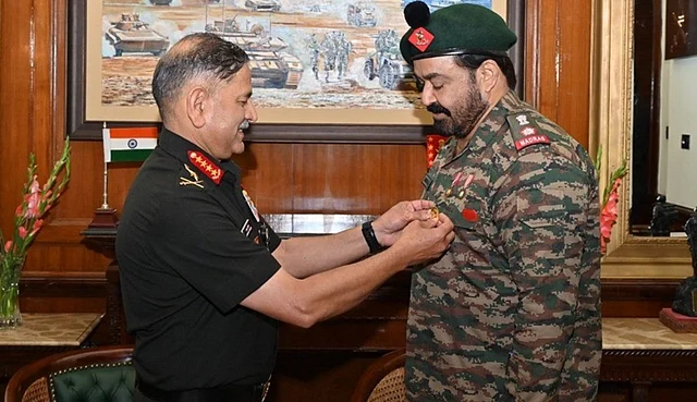 'ഇന്ന് ആർമി ഹെഡ്ക്വാർട്ടേഴ്സിൽ വെച്ച് സേനാമേധാവി ജനറൽ ഉപേന്ദ്ര ദ്വിവേദി (PVSM, AVSM) എന്നെ COAS കമ്മൻഡേഷൻ കാർഡ് നൽകി ആദരിച്ചു ഭാഗ്യം. ഹോണററി ലെഫ്റ്റനന്റ് കേണൽ എന്ന നിലയിൽ ഈ അംഗീകാരം സ്വീകരിക്കുന്നത് അതിയായ അഭിമാനവും നന്ദിയും നിറഞ്ഞ നിമിഷമാണ്. ജനറൽ ഉപേന്ദ്ര ദ്വിവേദിക്കും, ഇന്ത്യൻ സൈന്യത്തിനും, എന്റെ യൂണിറ്റായ ടെറിറ്റോറിയൽ ആർമിക്കും ഹൃദയംഗമമായ നന്ദി രേഖപ്പെടുത്തുന്നു,' മോഹൻലാൽ സോഷ്യൽ മീഡിയയിൽ കുറിച്ചു.