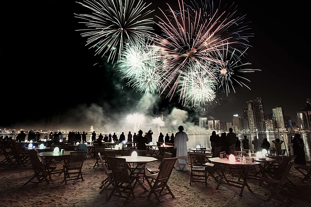 തിരക്കുകളിൽ നിന്നുമാറി, ശാന്തമായി പുതുവത്സരരാവിന്റെ നിറങ്ങൾ ആഘോഷിക്കാനുള്ള അവസരമാണ് അൽനൂർ ഐലൻഡ് ഒരുക്കുന്നത്. ദ്വീപിന്റെ കരയിലെ മണൽതിട്ടയിൽ പ്രത്യേകം തയാറാക്കിയ ഇരിപ്പിടങ്ങളിലിരുന്ന്, അൽ മജാസ് വാട്ടർഫ്രണ്ടിലെ കരിമരുന്ന് പ്രയോഗം കാണാം, ഷാർജ നഗരത്തിന്റെ മനോഹരദൃശ്യങ്ങൾ ആസ്വദിക്കാം, രുചികരമായ ഭക്ഷണം ആസ്വദിക്കാം. 30 മേശകളിലായി 120 പേർക്കുള്ള സൗകര്യമാണ് ഇവിടെ ഒരുക്കുന്നത്. മരുഭൂമിയിലെ മനോഹരകാഴ്ചകളുടെ പശ്ചാത്തലത്തിലാണ് മെലീഹ നാഷനൽ പാർക്കിലെ പുതുവത്സര ആഘോഷം. ‘ന്യൂ ഇയർ അണ്ടർ ദി സ്റ്റാർസ്’ എന്ന പ്രത്യേക പരിപാടി ഡിസംബർ 31 വൈകുന്നേരം തൊട്ട് പുതുവർഷപ്പുലരി വരെ നീണ്ടു നിൽക്കും. ടെന്റുകളിലെ താമസവും സംഗീതവും കലാപ്രകടനവും വാനനിരീക്ഷണവും വിജ്ഞാനപ്രദമായ സെഷനുകളും ഒട്ടകസവാരിയും ആർച്ചറിയടക്കമുള്ള വിനോദങ്ങളുമെല്ലാമായി പ്രകൃതിയും സംസ്കാരവും സാഹസികതയുമെല്ലാം സമ്മേളിക്കുന്നതാണ് ഇവിടത്തെ ആഘോഷം. രുചികരമായ ഭക്ഷണവും ഇതോടൊപ്പമുണ്ടാവും.