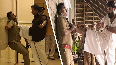 പൊലീസുകാരനെ മുട്ടുകാല്‍ കൊണ്ട് ഭിത്തിയില്‍ ചവിട്ടി നിര്‍ത്തുന്ന ചിത്രമാണ് ഇന്ന് സുരേഷ് ഗോപി ഷെയര്‍ ചെയ്തിരിക്കുന്നത്. ലൂസിഫറില്‍ മോഹന്‍ലാലിന്റെ സ്റ്റീഫന്‍ നെടുമ്പിള്ളി പൊലീസുകാരനെ ചവിട്ടിനിര്‍ത്തുന്ന മാസ് രംഗമുണ്ടായിരുന്നു. മോഹന്‍ലാല്‍ കാല് മുഴുവനായി ഉയര്‍ത്തിയാണ് പൊലീസുകാരനെ ഭയപ്പെടുത്തുന്നതെങ്കില്‍ സുരേഷ് ഗോപിയാകട്ടെ മുട്ടുകാല്‍ നെഞ്ചില്‍ ചവിട്ടിയാണ് പൊലീസിനെ ഭയപ്പെടുത്തുന്നത്.