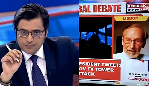 റഷ്യ-യുക്രൈൻ വിഷയത്തിൽ അർണബ് ഗോസ്വാമി നടത്തുന്ന ചർച്ച ഇന്ത്യൻ താത്പര്യത്തിന് എതിരാണെന്ന് ലിസ്ബണിൽ നിന്ന് ചാനൽ ക്ഷണിച്ച പാനലിസ്റ്റ് ഗിൽബേർട്ട് ഡോക്ടറോ. ചർച്ചയിലെ അർണബിന്റെ രീതികളെ രൂക്ഷമായി കടന്നാക്രമിച്ച് കൊണ്ടായിരുന്നു ഗിൽബേർട്ടിന്റെ വിമർശനം. നിങ്ങൾ എന്നെ സംസാരിക്കാൻ അനുവദിക്കുന്നുണ്ടോ, അതോ ഞാനിവിടെ കാണാൻ ഇരിക്കുന്നതാണോ? എന്ന് പറഞ്ഞ ഗിൽബർട്ട് അർണബ് ഒരു കങ്കാരു കോടതിയുണ്ടാക്കിയിരിക്കുകയാണെന്നും പറഞ്ഞു.