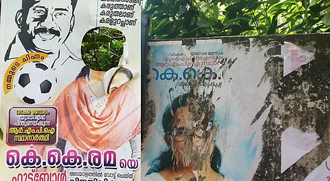 വടകരയില് യുഡിഎഫ് പിന്തുണയ്ക്കുന്ന ആര്എംപി സ്ഥാനാര്ത്ഥി കെകെ രമയുടെ തിരഞ്ഞെടുപ്പ് പോസ്റ്ററുകളിലെ തലവെട്ടി മാറ്റിയ നിലയില്.