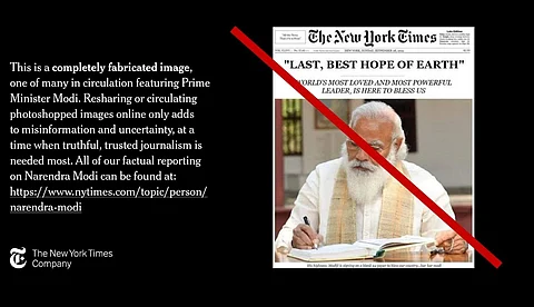 '' ഇത് കെട്ടിച്ചമച്ച ചിത്രമാണ്. ഫോട്ടോഷോപ്പ് ചെയ്ത ചിത്രങ്ങള് പ്രചരിപ്പിക്കുന്നതും റീഷെയര് ചെയ്യുന്നതും തെറ്റിധാരണയുണ്ടാക്കുകയും അസ്ഥിരത ഉണ്ടാക്കുകയേ ചെയ്യുകയുള്ളുവെന്നും ന്യൂയോര്ക്ക് ടൈംസ് ട്വീറ്റ് ചെയ്തു. നരേന്ദ്ര മോദിയെക്കുറിച്ച് തങ്ങള് ചെയ്തു വസ്തുതാപരമായ വാര്ത്തകളുടെ ലിങ്ക് കൂടി ഉള്പ്പെടുത്തിയാണ് ന്യൂയോര്ക്ക് ടൈംസിന്റെ ട്വീറ്റ്.