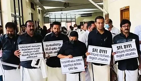ഷാഫി പറമ്പില്, അന്വര് സാദത്ത്, റോജി എം ജോണ്, സനീഷ് കുമാര്, എല്ദോസ് കുന്നപ്പിള്ളി, തുടങ്ങിയ എം.എല്.എമാരാണ് കറുത്ത വസ്ത്രവും മാസ്കും അണിഞ്ഞ് സഭയില് എത്തിയത്.