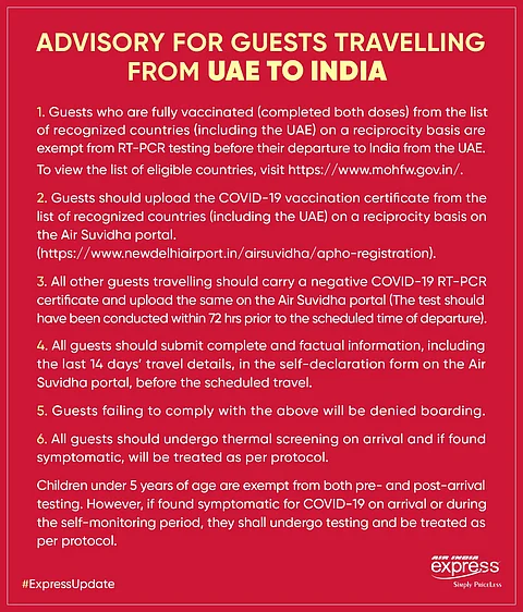 യുഎഇയില് നിന്നും ഇന്ത്യയിലേക്ക് യാത്രചെയ്യുന്നവർക്കുളള കോവിഡ് മാർഗ്ഗനിർദ്ദേശങ്ങള് ഓർമ്മപ്പെടുത്തി എയർഇന്ത്യ എക്സ് പ്രസ്.ഈദ് അവധിദിനങ്ങളില് യാത്രകള് വർദ്ധിച്ച സാഹചര്യത്തിലാണ് ഓർമ്മപ്പെടുത്തല്