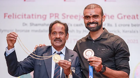 ഇന്ത്യക്ക് വേണ്ടി 49 വര്ഷം മുമ്പ് ഹോക്കിയില് വെങ്കലം നേടിയ മാനുവല് ഫ്രെഡറിക്കും 2021ല് ടോക്കിയോ ഒളിമ്പിക്സില് പുരുഷ ഹോക്കിയില് വെങ്കലം നേടിയ പി ആര് ശ്രീജേഷും ഒരു വേദിയില്. രണ്ട് മലയാളി ഒളിമ്പിക് മെഡല് ജേതാക്കള് കൊച്ചിയിലാണ് കൂടിക്കാഴ്ച നടത്തിയത്. വര്ഷങ്ങള്ക്ക് ശേഷം ഹോക്കിയില് രാജ്യം കിരീടമണിഞ്ഞപ്പോള് വിജയശില്പിയായ പി.ആര്.ശ്രീജേഷിനെ കണ്ടതും മ്യൂണിക്കില് നിന്ന് വെങ്കല മെഡലുമായെത്തിയ ആ 25 കാരനെ മാനുവല് ഫ്രെഡറിക്കും ഓര്ത്തു. അര്ഹിച്ച അംഗീകാരങ്ങള് പോലും ലഭിക്കാതിരുന്ന ആ കാലത്ത് നിന്ന് ഒളിമ്പിക് മെഡല്ജേതാവിനെ വീരോചിതം ഹൃദയത്തോട് ചേര്ക്കുന്നതിലേക്ക് മലയാളക്കര മാറിയിരിക്കുന്നു. യുഎഇ അസ്ഥാനമായ വിപിഎസ് ഹെല്ത്ത് കെയറിന്റെ ചെയര്മാനും മാനേജിംഗ് ഡയറക്ടറുമായ ഡോ. ഷംഷീര് വയലില് പ്രഖ്യാപിച്ച ഒരു കോടി രൂപയുടെ സ്നേഹ സമ്മാനം പി.ആര്. ശ്രീജേഷിന് നല്കുന്ന ചടങ്ങാണ് കേരളത്തില് ഒളിമ്പിക് മെഡലെത്തിച്ച രണ്ട് മഹാരഥന്മാരെ ഒരേ വേദിയിലെത്തിച്ചത്.