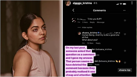 ബിജെപിയാണോ എന്ന ചോദ്യത്തിന് അഹാന കൃഷ്ണയുടെ മറുപടി. ‘നിങ്ങള് ബിജെപിയാണോ’ എന്നാണ് അഹാനയുടെ ഇൻസ്റ്റാഗ്രാം പോസ്റ്റിന് താഴെ എത്തിയ കമന്റ്. ‘ഞാന് മനുഷ്യനാണ്. കൂടുതല് മെച്ചപ്പെട്ട മനുഷ്യനാകാനാണ് ശ്രമിക്കുന്നത്. നിങ്ങളോ?” എന്ന് താരം തിരിച്ച് ചോദിക്കുന്നു.