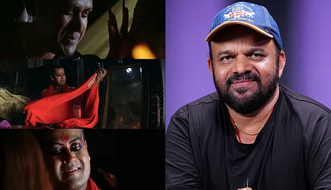 അനന്തഭദ്രത്തിലെ കോസ്റ്റ്യും ഡെെ ചെയ്താണ് ഉപയോഗിച്ചിരിക്കുന്നത്. ആ സിനിമ ഷൂട്ട് ചെയ്യുന്ന സമയത്ത് അത്രയും നിറങ്ങൾ ലഭ്യമായിരുന്നില്ല. അതിന് വേണ്ടി കസവിന്റെ മുണ്ടുകൾ ഡെെ ചെയ്തിട്ടുണ്ട്. കസവ് മുണ്ട് ഡെെ ചെയ്താണ് നെടുമുടി വേണു ചേട്ടന്റെ തമ്പുരാൻ കഥാപാത്രത്തിന് ഉപയോഗിച്ചത്. അത് മുഴുവൻ മ്യൂറലിന്റെ ബേസിൽ നിന്നു കൊണ്ട് ഞാൻ ചെയ്ത സിനിമയാണ്. മ്യൂറലിൽ നിന്ന് മാറിയിട്ടേയില്ല. സന്തോഷേട്ടനും പറഞ്ഞു നമുക്ക് ആ മ്യൂറൽ പെയ്ന്റിംഗ്സിന്റെ രീതിയിലായിരിക്കണം കഥാപാത്രങ്ങളുടെ കോസ്റ്റ്യും തീരുമാനിക്കേണ്ടത് എന്ന്. പിന്നെ ആ ദിംഗംബരന്റെ ഇൻട്രോഡക്ഷന്റെ മുഴുവൻ ക്രെഡിറ്റും സന്തോഷേട്ടനാണ്. എങ്ങനെയാണ് വേണ്ടത് എന്ന് പറഞ്ഞപ്പോൾ ആ രീതിയിൽ നമ്മൾ ചെയ്തു കൊടുത്തുവെന്ന് മാത്രം. ഒരു ദിവസം എന്നോട് നമ്മുടെ കയ്യിൽ എത്ര ബ്ലാക്ക് ഉണ്ട് എന്ന് ചോദിച്ചു. കളരിക്ക് വേണ്ടി വാങ്ങി വച്ചിരിക്കുന്ന റെഡും ബ്ലാക്കും കൂടി ഒരു അമ്പത് മീറ്റർ ഉണ്ട് എന്ന് പറഞ്ഞു. അപ്പോൾ സന്തോഷേട്ടൻ പറഞ്ഞു എനിക്ക് ഒരു നാനൂറ് മീറ്റർ വേണം. നമുക്ക് ദിംഗംബരന്റെ ഇൻട്രോ എടുക്കണം, നല്ല ഫ്ലോ വേണം, ഒരാള് ചാടുമ്പോൾ ഇങ്ങനെ പറന്ന് വരണം എന്ന്. ഈ പറത്തി വിടൽ എങ്ങനെ നടക്കും എന്ന് ഞാൻ ചോദിച്ചു. പത്ത് മീറ്ററൊക്കെയെ പറത്തി വിടാൻ പറ്റുള്ളൂ. അപ്പോൾ അത്രയും നെെസായ തുണി എടുക്കണം എന്ന് എന്നോട് പറഞ്ഞു. അങ്ങനെ ഞാൻ തൃശ്ശൂരിൽ പോയി എടുക്കാൻ പറ്റുന്നത്രയും തുണിയെടുത്തു. അങ്ങനെ ഒരു ദിവസം ഇരിക്കുമ്പോഴാണ് ഇത് ഷൂട്ട് ചെയ്യാം എന്ന് പറയുന്നത്.